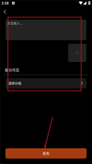 3、在动态页面,填写内容并设置分组后,点击发布按钮即可发布动态。