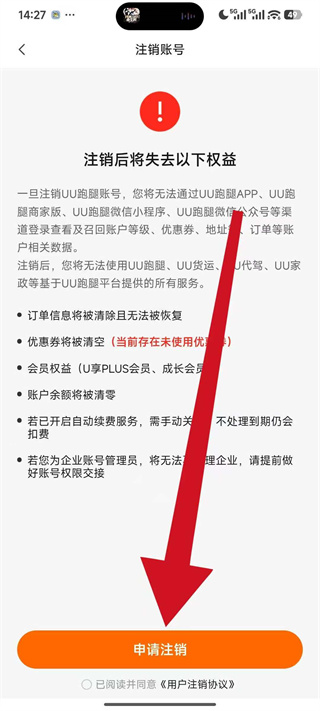 5、在注销账号页面勾选协议,点击申请注销,完成账号注销的申请操作。