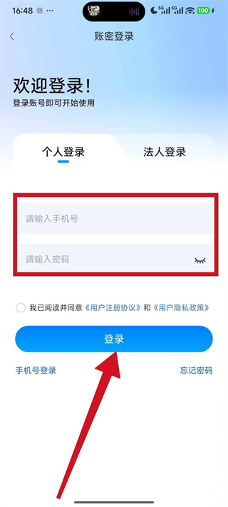 4、在账密登录页面填写账号密码,勾选相关协议后,点击登录完成账号密码登录。