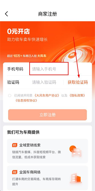 2、在注册账号页面填写手机号码后,点击获取验证码。