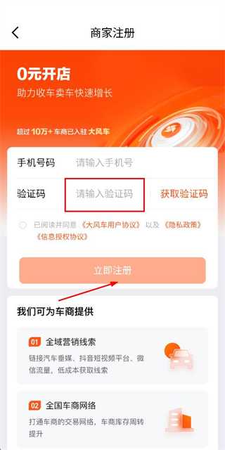 3、在注册账号页面填写验证码,勾选协议后点击立即注册完成注册操作。