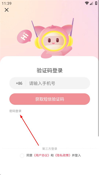 2、在登录页面,点击密码登录选项,可切换至密码登录页面。