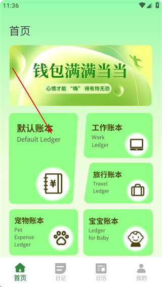 1、进入首页后,点击默认账本选项,可进入默认账本的详情页面。