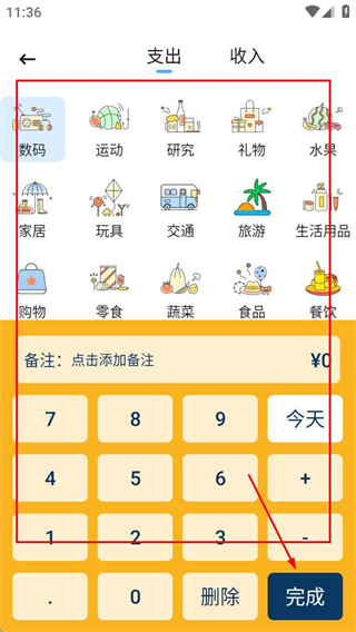 3、在编辑页面,输入好内容后,点击完成按钮即可记录该笔收支。