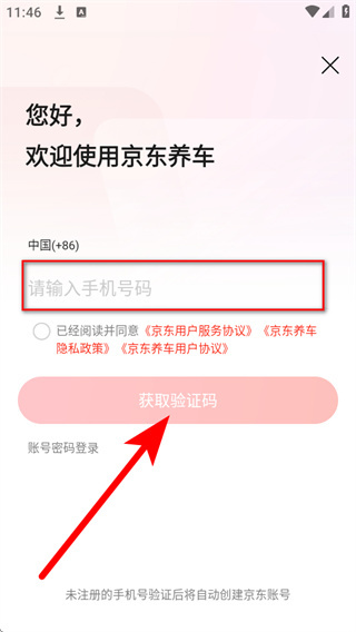 3、在登录界面的手机号码栏填写手机号,勾选相关协议后,点击获取验证码。