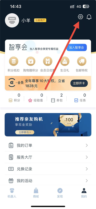 2、在我的页面右上角,找到设置图标并点击,进入设置相关操作界面。