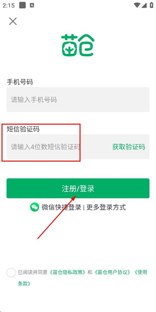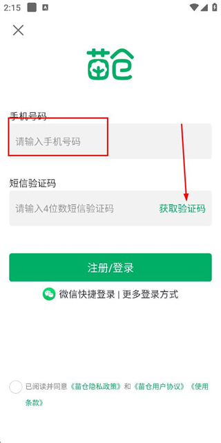 2、在登录页面填写手机号,勾选协议后,点击获取验证码。