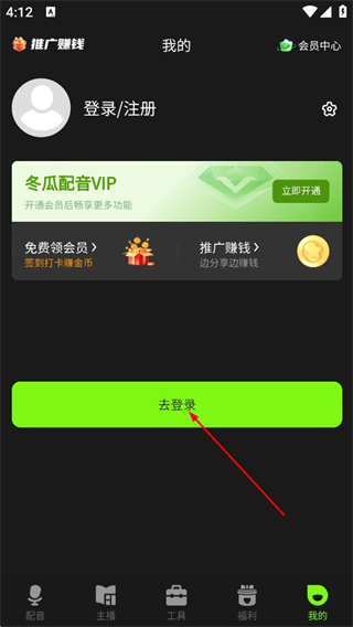 1、在冬瓜配音的配音首页,点击底部的我的选项,进入个人页面。