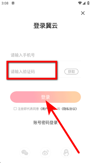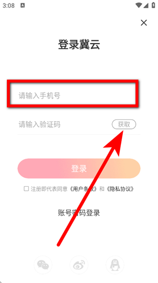 3、在登录冀云页面,输入手机号,点击获取验证码。