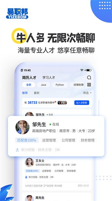 易职邦是江西易职邦人力资源有限公司开发的线上招聘软件,通过该软件可以实现动态化浏览和筛选简历,帮助你赢得面试机会,同时会有专门的配套课程,帮助你求职,涵盖范围广、支持百余种就业方向,降低培训成本,使得学员在线上即可学习到实用课程,取得实质进步,快来下载吧!