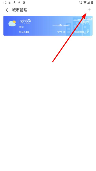 3、在城市管理界面,找到右上角的添加按钮并点击,进入城市选择的定位页面。