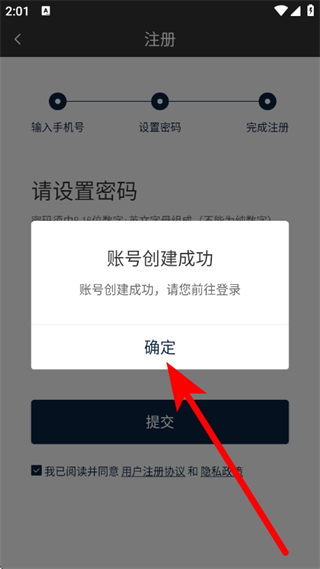 4、弹出账号创建成功提示框,点击确定,完成注册。
