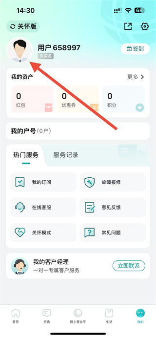 1、进入网上国网app,在个人页面点击用户头像区域,进入个人信息相关界面。