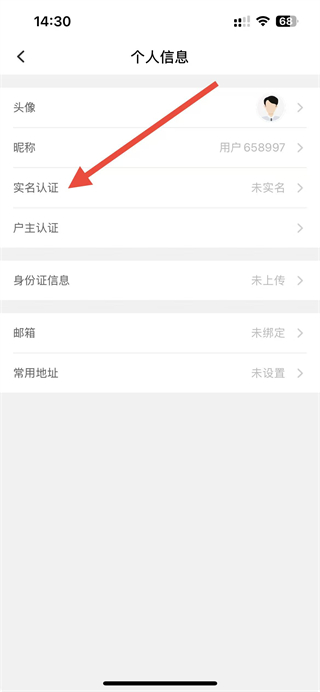 2、在个人信息页面,找到实名认证选项并点击,进入身份信息相关界面。