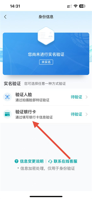 3、在身份信息页面,选择验证银行卡选项,进入银行卡验证的操作界面。