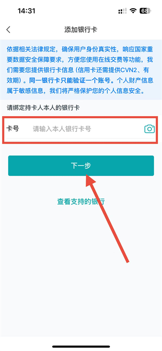 4、在添加银行卡页面,输入本人银行卡号,点击下一步继续完成验证流程。