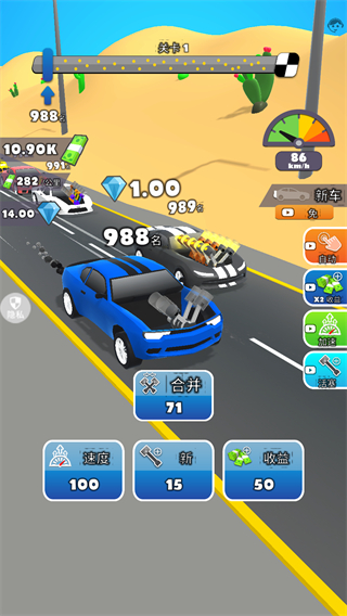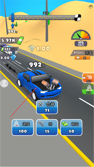 1、在赛道中操控汽车,点击合并按钮融合车辆,提升汽车等级,积累收益。