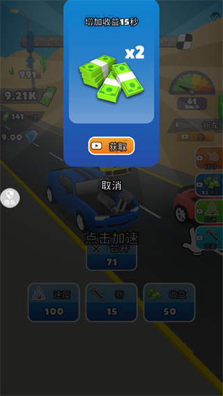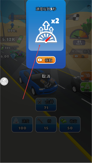 2、继续合并车辆,提升汽车价值,同时收集道路上的道具,增加收益数值。
