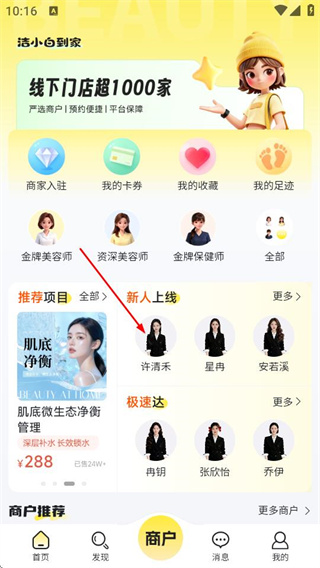 1、进入洁小白到家后,点击目标美容师,可进入该美容师的详情页面。