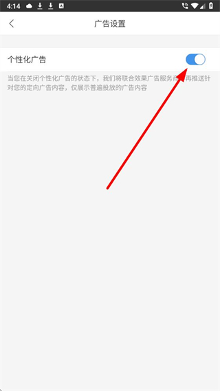 4、在广告设置页面中,找到个性化广告对应的开关按钮并点击,即可关闭广告推送。