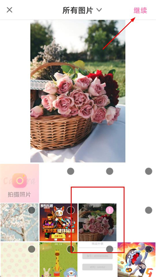 3、在图片页面,选择目标图片后点击继续按钮,可进入笔记编辑页面。