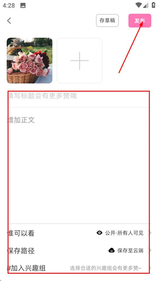 4、在编辑页面,填写内容后点击发布按钮,即可成功写笔记。