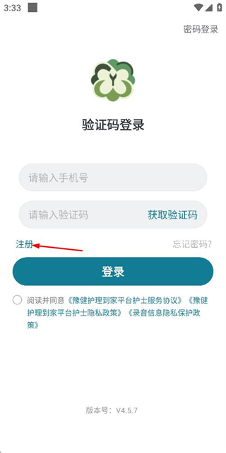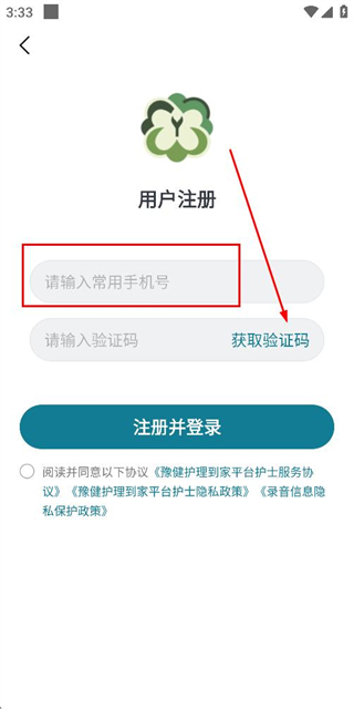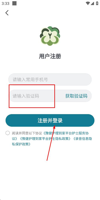 3、在注册账号页面填写验证码,勾选协议后点击注册并登录完成注册操作。