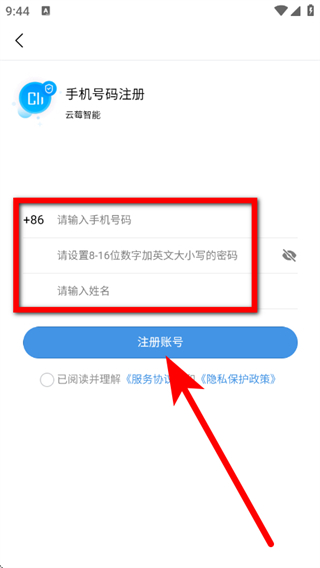 4、在手机号码注册页面,输入手机号码,设置密码,勾选协议后,点击注册账号,完成注册。