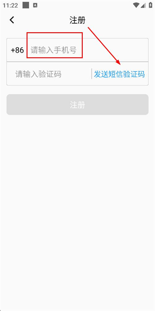 2、在注册账号页面填写手机号码后,点击发送短信验证码。
