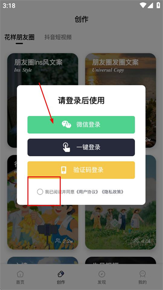 2、在创作页面,点击目标文案分类,可触发登录提示窗口。