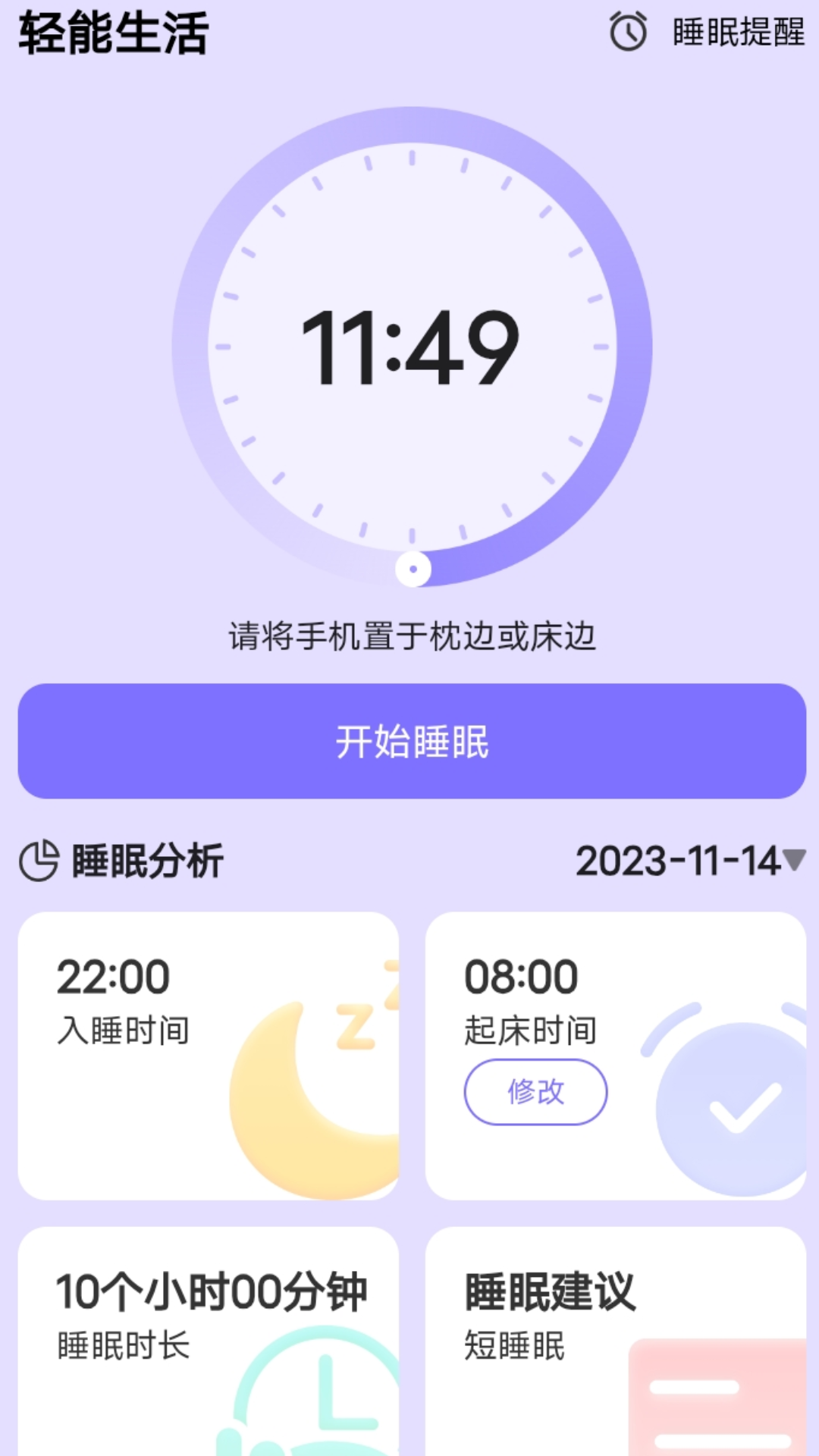 轻能生活最新版是一款旨在帮助用户监测和改善睡眠的应用程序,它通过使用内置的睡眠检测功能,可以实时记录你的睡眠模式、周期和质量,形成详细的睡眠报告,基于智能算法和大数据分析,app提供了个性化的睡眠建议和调整方案,有助于你能更好地理解自己的睡眠状态,并针对不同的问题提供了专业的优化解决方案,此外,它还提供了一系列实用的功能,如睡前放松音乐、自然声音等,以实现更健康、更高质量的睡眠。