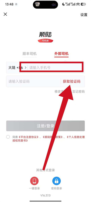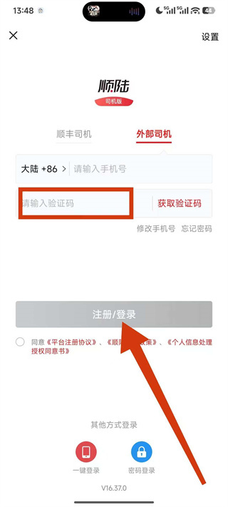 4、将收到的短信验证码填入验证码栏,勾选同意相关协议后,点击注册登录完成账号登录。