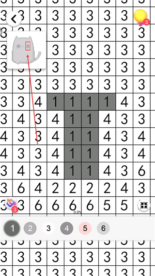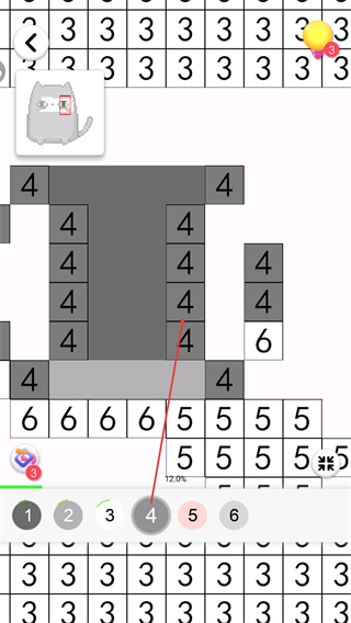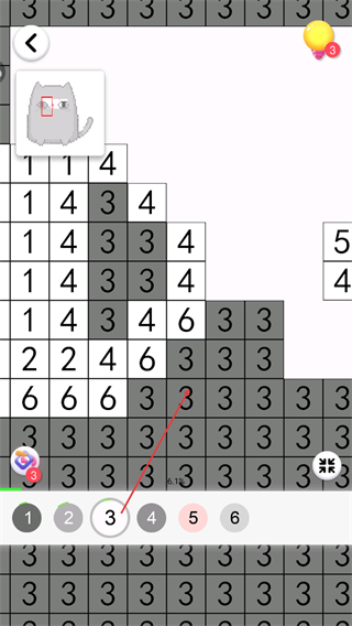 2、选择下方数字3,为图中数字3的区域填色,推进图案成型。