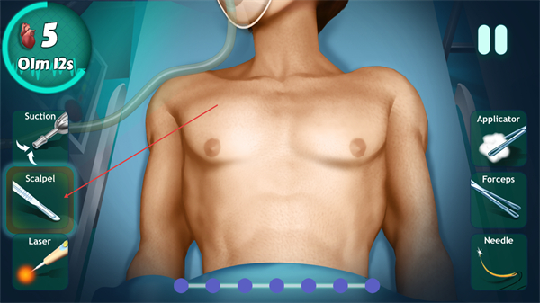 1、选择左侧Scalpel手术刀,在患者胸部区域划开切口,开启手术步骤。