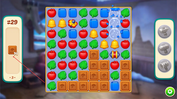 1、优先消除木板图案,积累左侧进度条,同时利用特效道具如爆炸类扩大消除范围。