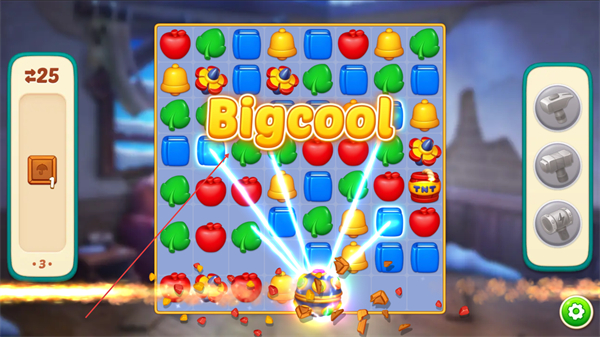 3、借助大范围特效的消除效果,继续清理剩余图案,推进进度条接近目标。