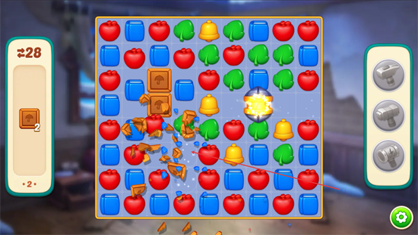 1、消除木板图案,积累左侧进度条,同时触发特效道具如爆炸类批量消除图案。
