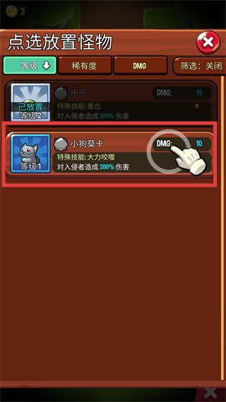 3、在【点选放置怪物】界面,选择【小狗莫卡】(等级1、特技大力咬噬),查看其【10】点伤害属性。