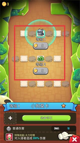 4、将【小狗莫卡】放置在选好的空位,消耗【5】金币完成布置,与【乐乐】配合提升关卡防御能力。