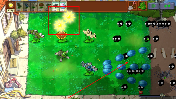 3、及时收集场景中的【阳光】,积累足够后种植【西瓜投手】,其能对僵尸造成范围伤害并附带击退效果。