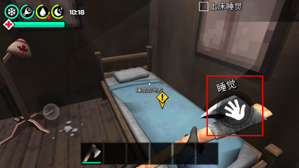 1、在室内场景找到床后执行【睡觉】操作,可有效恢复角色状态,为后续离开房子的探索行动储备必要精力。