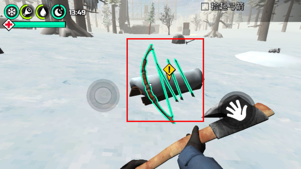 3、到达室外雪地场景后捡起【弓箭】,获取该武器为后续瞄准攻击目标提供装备支持,提升生存能力。