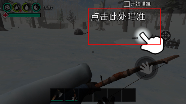 4、装备弓箭后执行【开始瞄准】-【点击此处瞄准】操作,对准目标区域精准攻击,完成狩猎或防御任务。