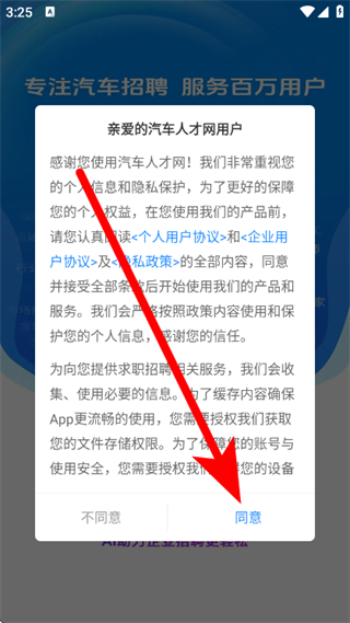 1、打开中国汽车人才网,弹出用户协议与隐私政策弹窗,点击同意。