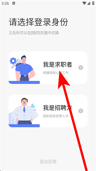 2、在登录身份选择页面,点击我是求职者,进入手机号登录注册页面。