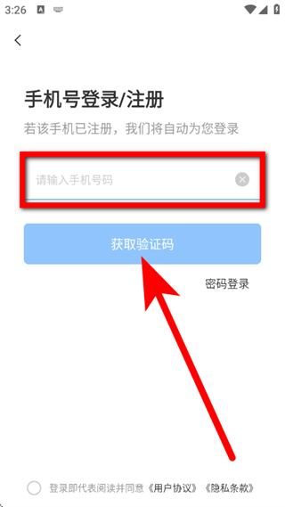 3、在手机号登录注册页面,输入手机号码,点击获取验证码。