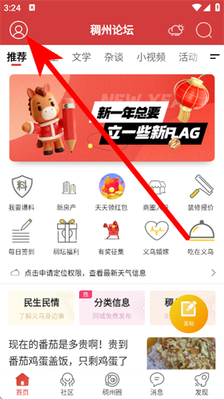1、在义乌稠州论坛首页,点击左上角的个人图标,进入我的页面。
