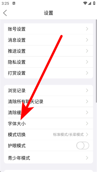 3、在设置页面,点击选择字体大小,进入字体大小设置页面。