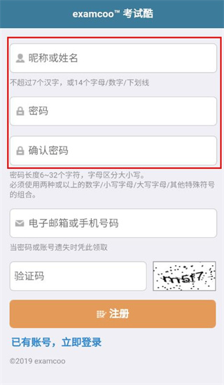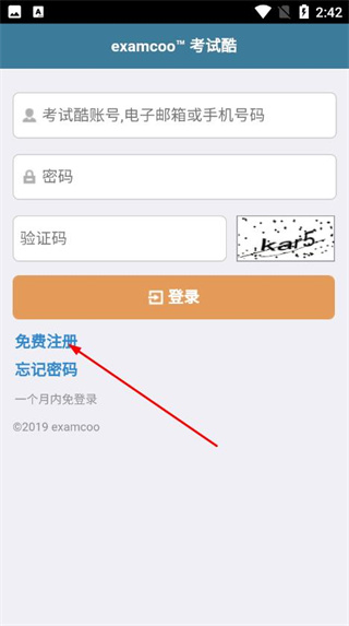 1、打开考试酷的登录页面,点击免费注册选项,进入注册界面。