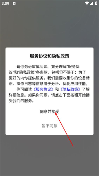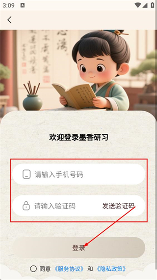 1、阅读服务协议和隐私政策后,点击同意,进入墨香研习的首页。